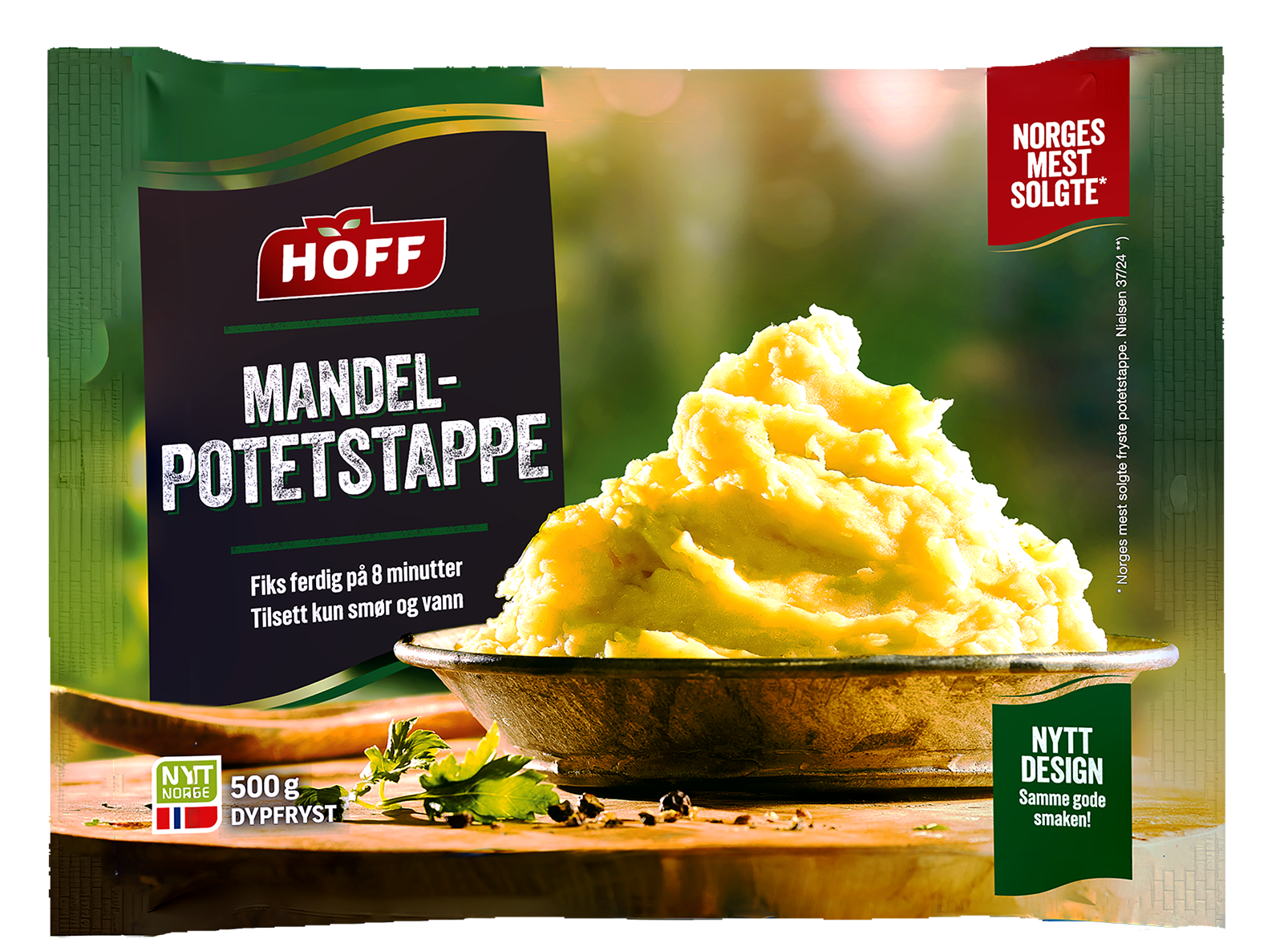 HOFF Mandelpotetstappe er en fryst, helt ferdig potetstappe av mandelpotet. Tilsett vann og smør og varm opp!